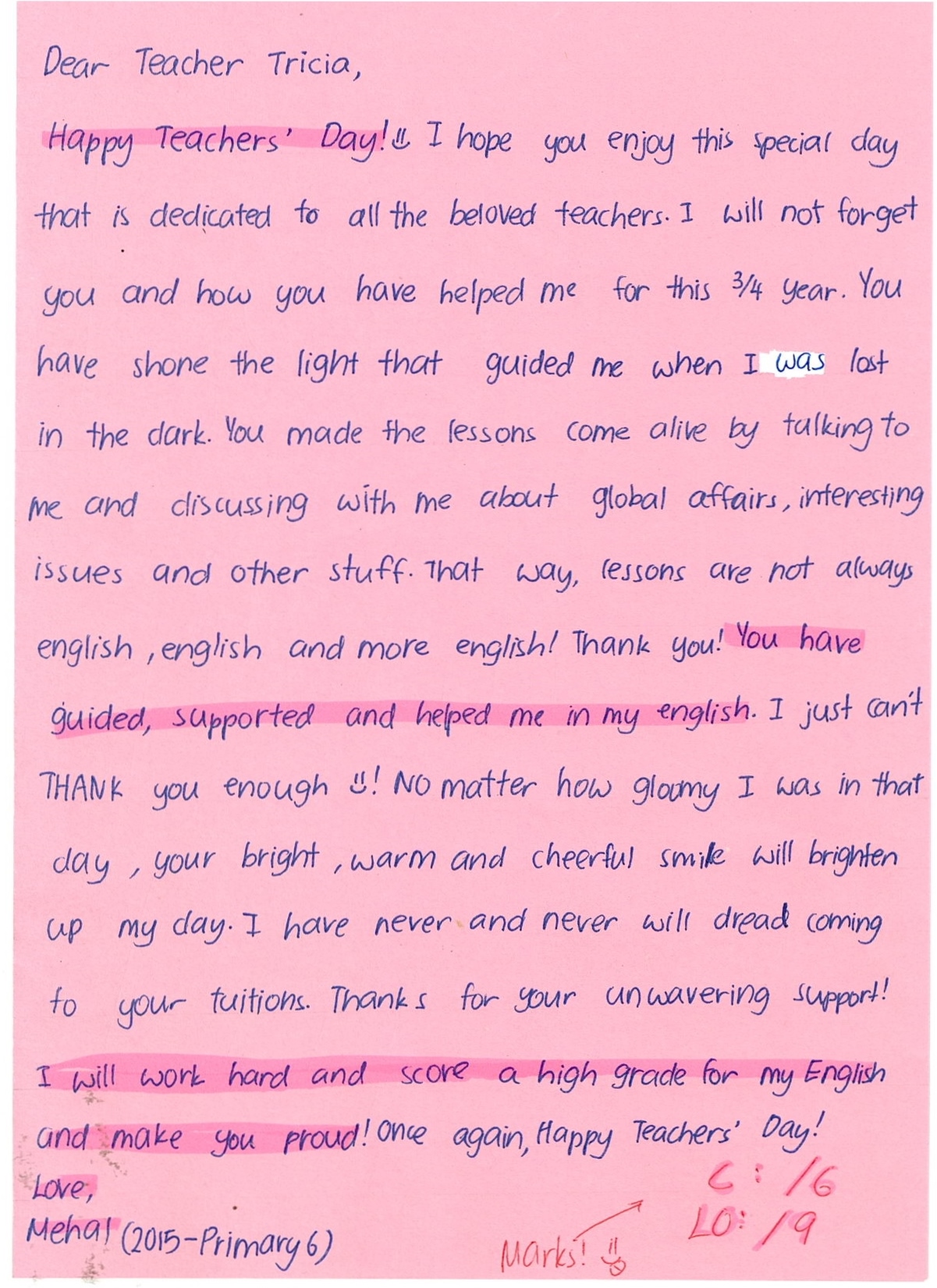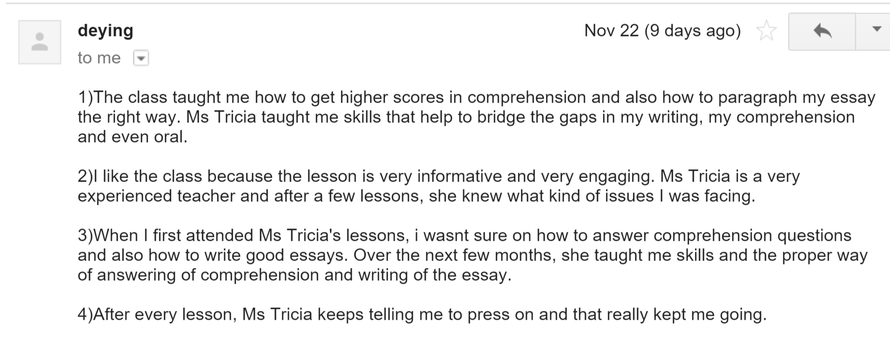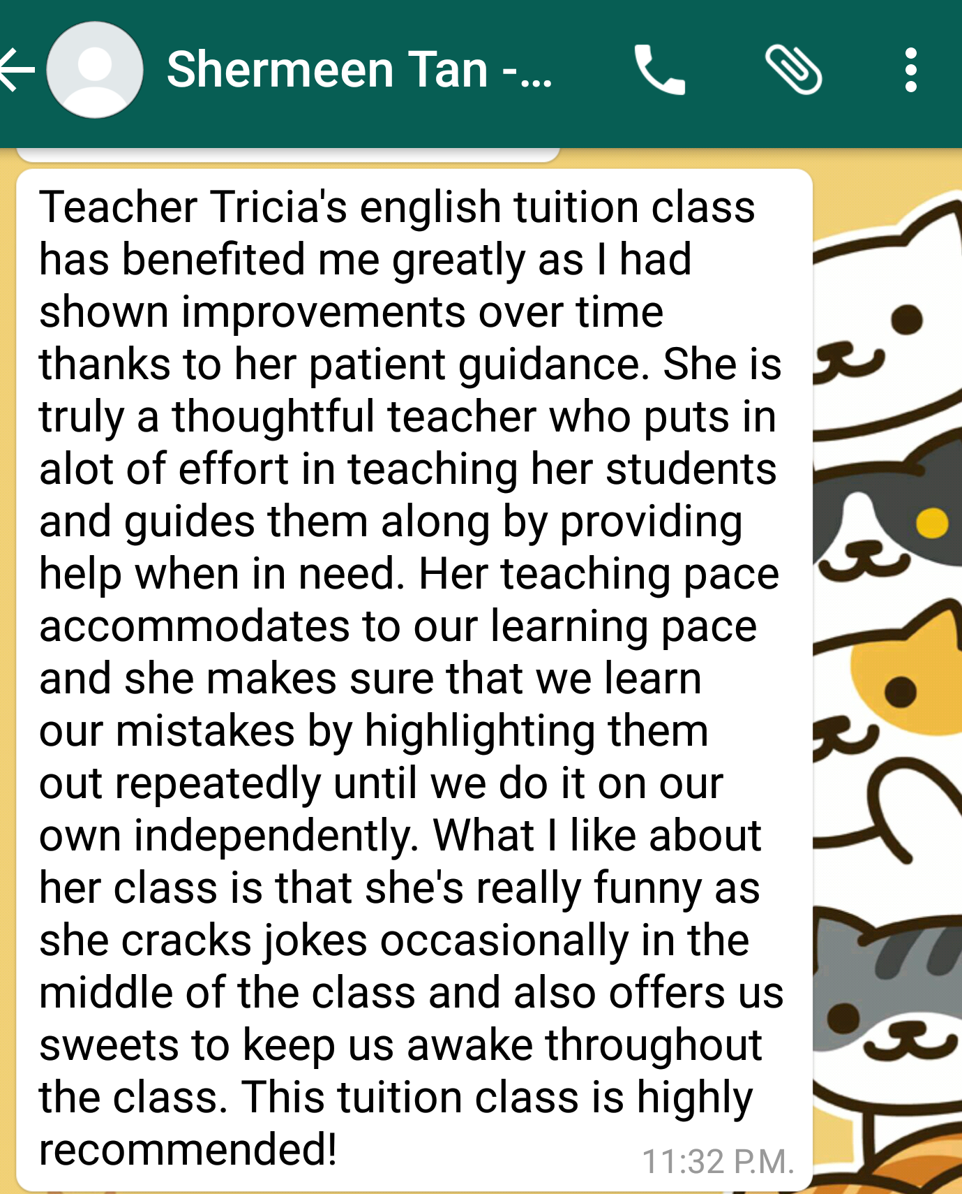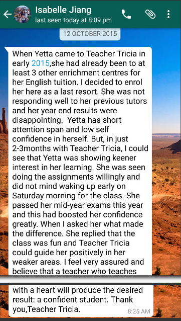 Ms Tricia is communicative. When I first attended her lessons, I was very shy. But now, I can talk to her freely. She has also helped me made significant improvements in my English. Though I was a B student at first, I am now scoring an A for my English.