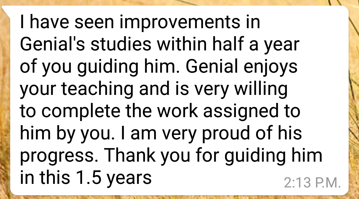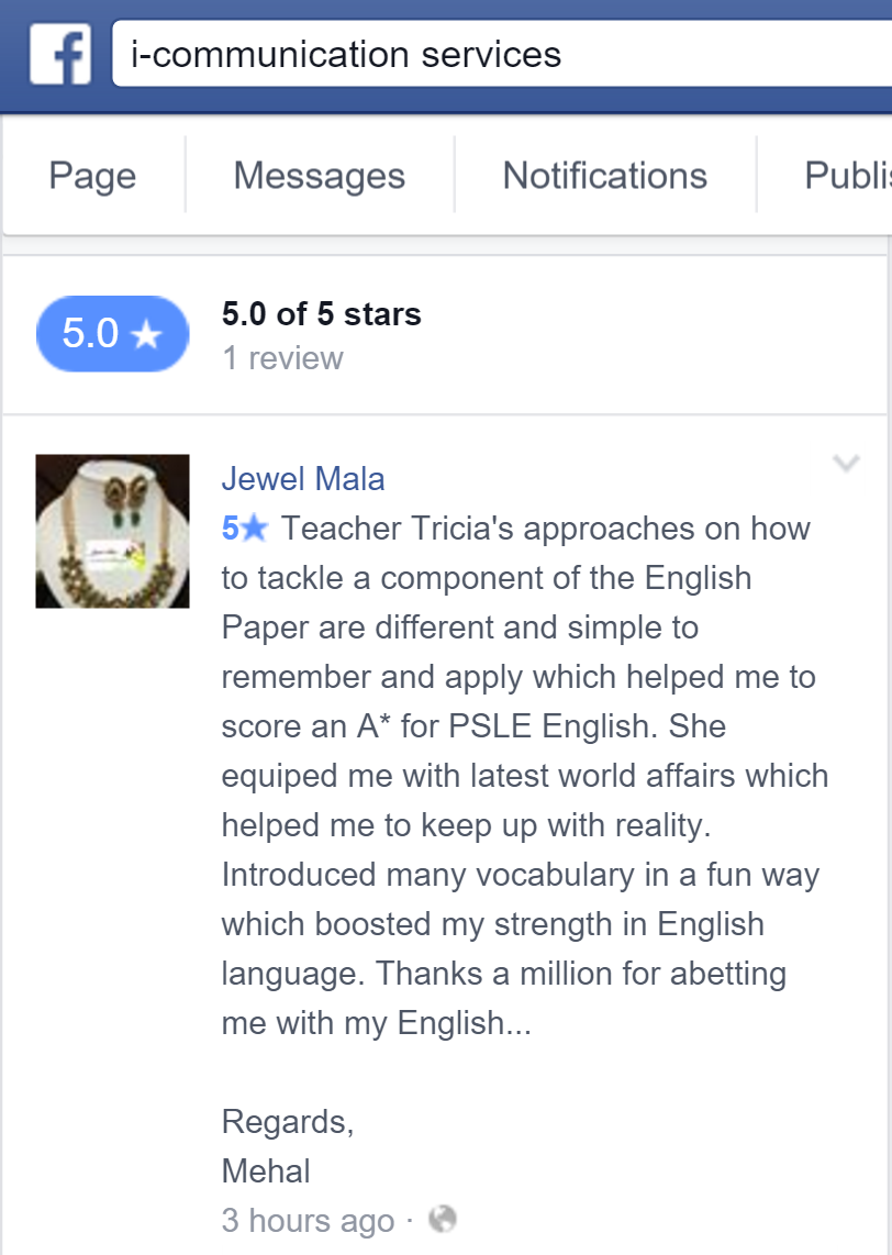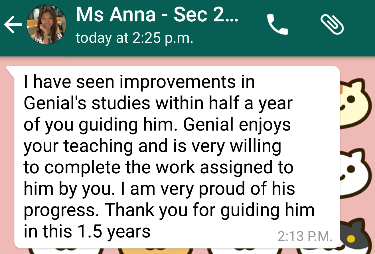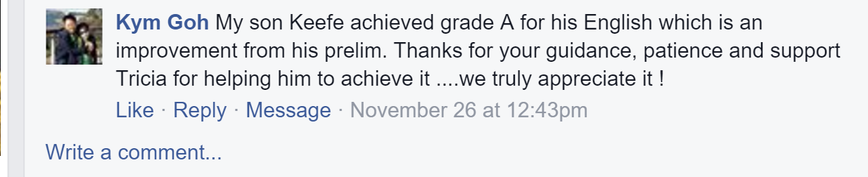 “My son, Rafiq, was very weak in his English. I was very worried when he failed his P6 prelim. Ms Tricia did her best to help my son and he managed to pass his PSLE English with a C.”